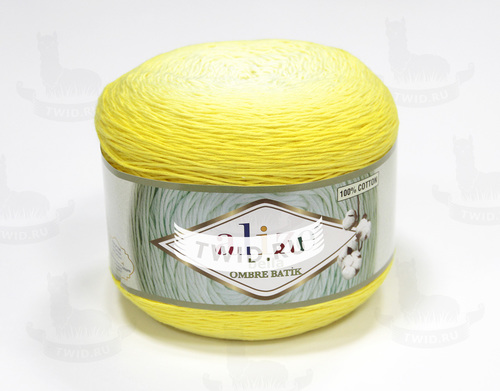 Состав:Хлопок 100% Вес мотка:250 г Метраж:900 м / 250 г Цвет:Лимонный с переходом цвета Страна:Турция Производитель:Alize