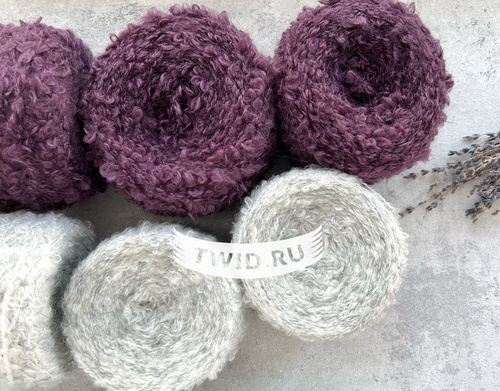 Набор букле Mirka (Акрил 52%, Мохер 20%, ПА 18%, Шерсть 10%, 120 м / 100 г) и серого букле (300 м / 100 г): — серый 350 г; — Фиолетовый 300 г.