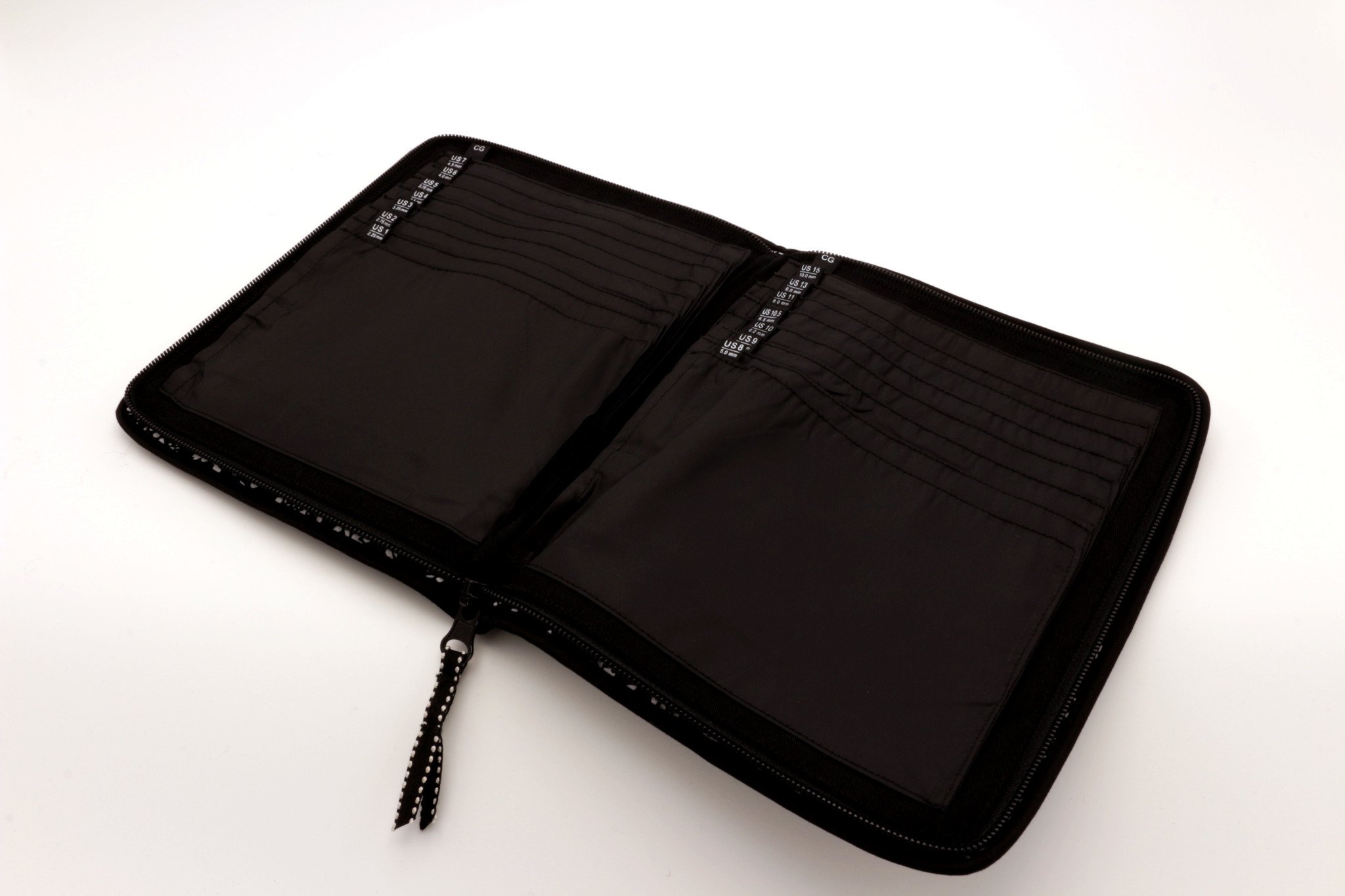 Внутри чехла 16 промаркерованных кармашков для хранения круговых спиц, каждый кармашек закрывается на липучку.