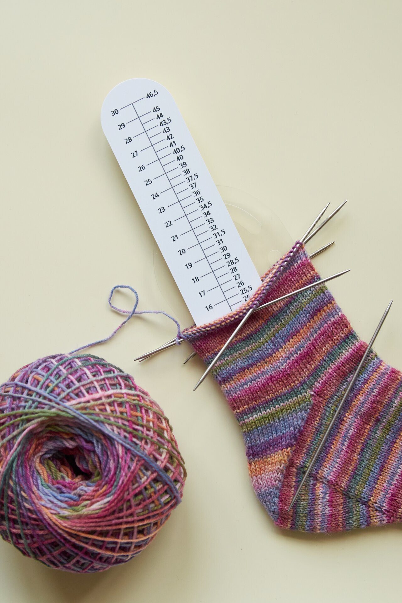 Линейка для измерения носка от Milada — удобный инструмент для измерения длины носка по стопе во время вязания. Позволяет с легкостью связать нужный размер носков (от 16.5 до 46.5 размеров).